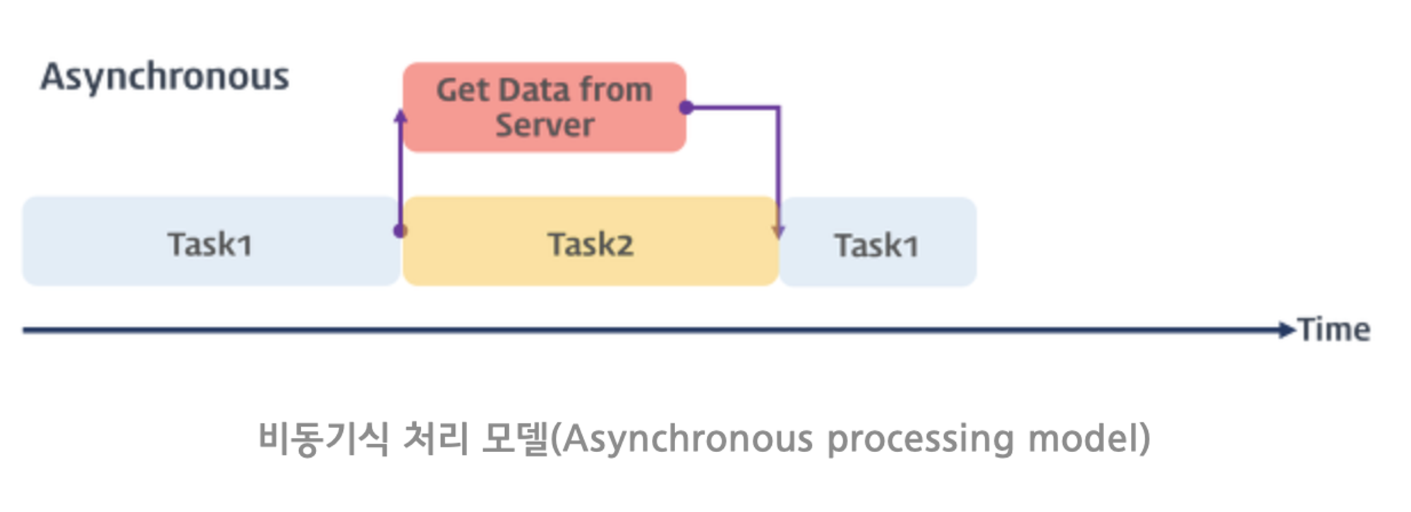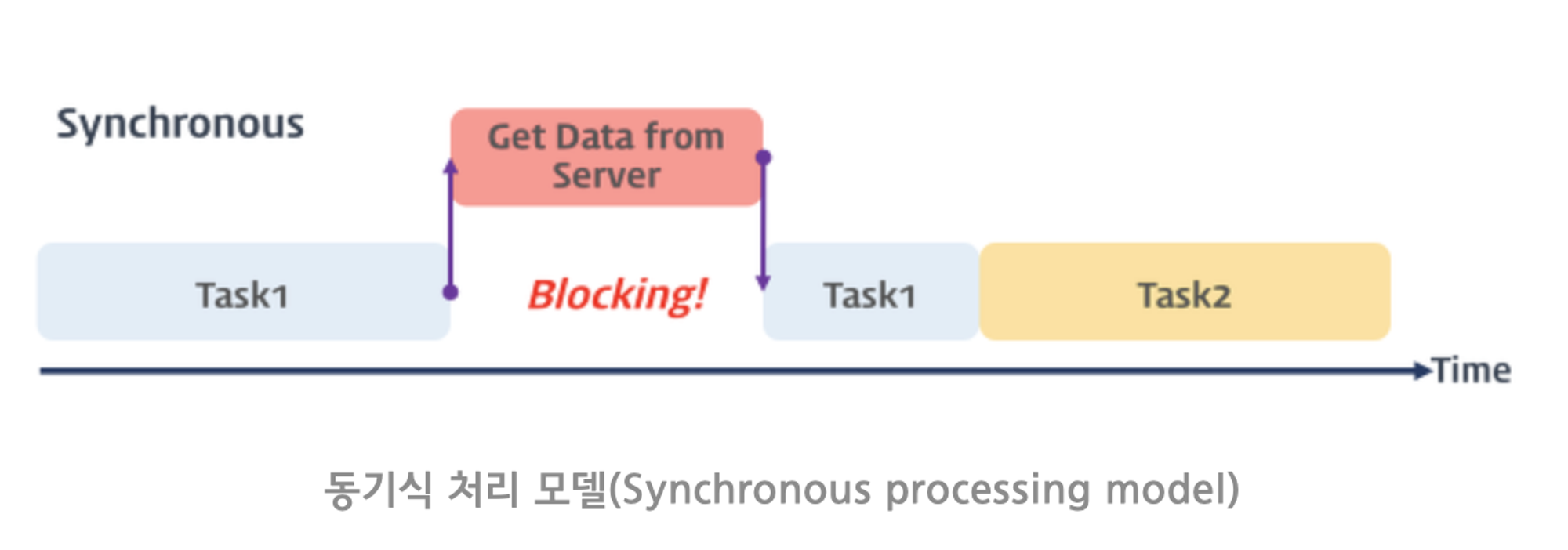프로그램에 쓰여진 순서대로 태스크가 처리되기 때문에 데이터 조회가 끝날 때까지 태스크1의 처리가 중단되어 사용자 입장에서는 화면이 멈춰있는 것처럼 보인다.